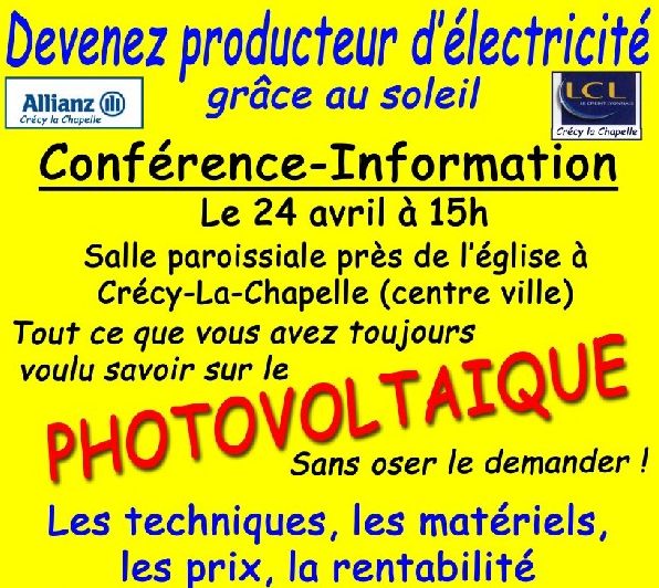 Ils ont bien raison car le besoin est là : – Tout d’abord des évolutions réglementaires qu’il est important de connaître, en termes de tarifs notamment. – Ensuite la vigueur et je dirais même la violence avec laquelle tous les vendeurs du secteur nous agressent quotidiennement au travers de coups de fil répétés pour nous vendre à tout prix des installations photovoltaïques. Cette conférence est prévue le dimanche 24 avril à 15h dans la salle située derrière l’église de Crécy. Comme pour les autres fois, Les Brionautes s’associent à cet événement, notamment en en relayant la promotion mais aussi les compte-rendu et les développements. |