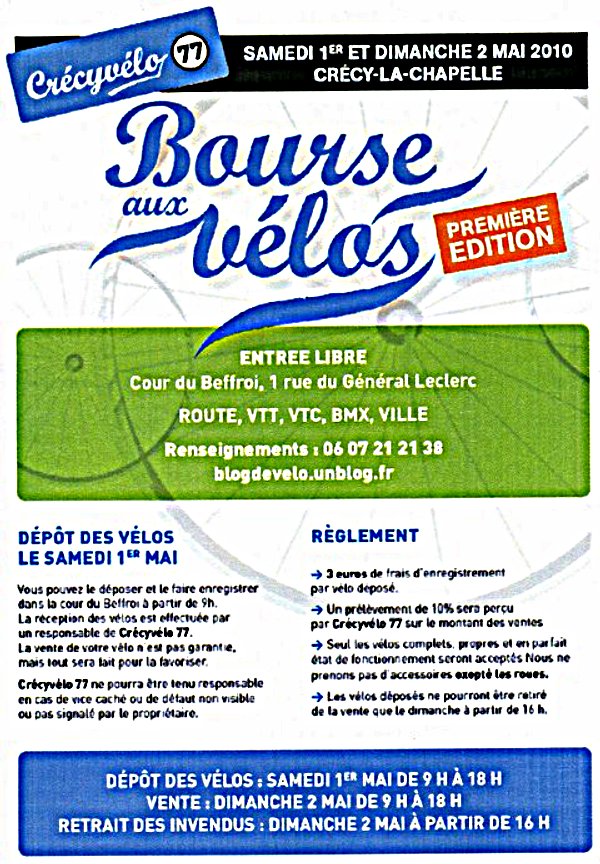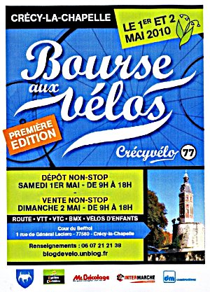 Il semble que votre site traite de sujets divers et variés, mais rende également compte des activités des associations locales. C’est à ce sujet que nous intervenons. Nous sommes Crécyvélo 77, jeune association déclarée en préfecture en novembre 2009 et adhérante à la FFCT (Fédération Française de Cyclotourisme) depuis janvier 2010. Nous pratiquons le vélo de type loisir sportif, sans but de compétition, et effectuons entre 70 et 100 kilomètres chaque dimanche. La distance varie en fonction de la saison et de l’heure du rendez-vous. Des renseignements sur notre club sont disponibles sur notre blog: http://blogdevelo.unblog.fr/ Les 1er et 2 mai, nous organisons, cour du Beffroi, une bourse aux vélos et nous souhaiterions que les Brionautes se fassent l’écho de cette manifestation qui est déjà annoncée par le site de la mairie, les panneaux lumineux et aussi par affiches. En espèrant que vous pourrez donner une suite favorable à notre demande, nous souhaitons longue vie aux Brionautes. Régis Maubourguet Président de Crécyvélo 77" |