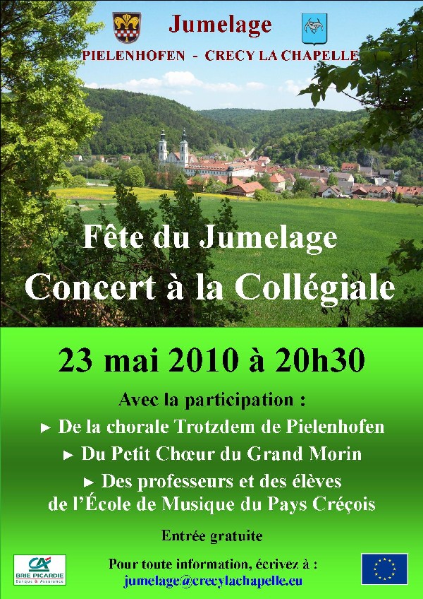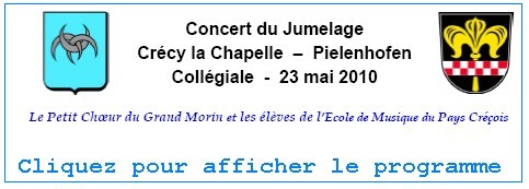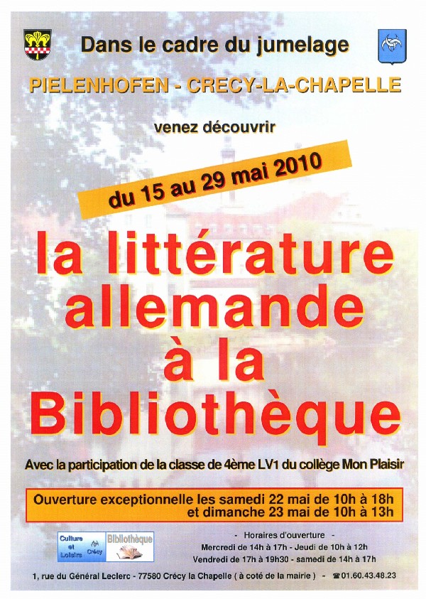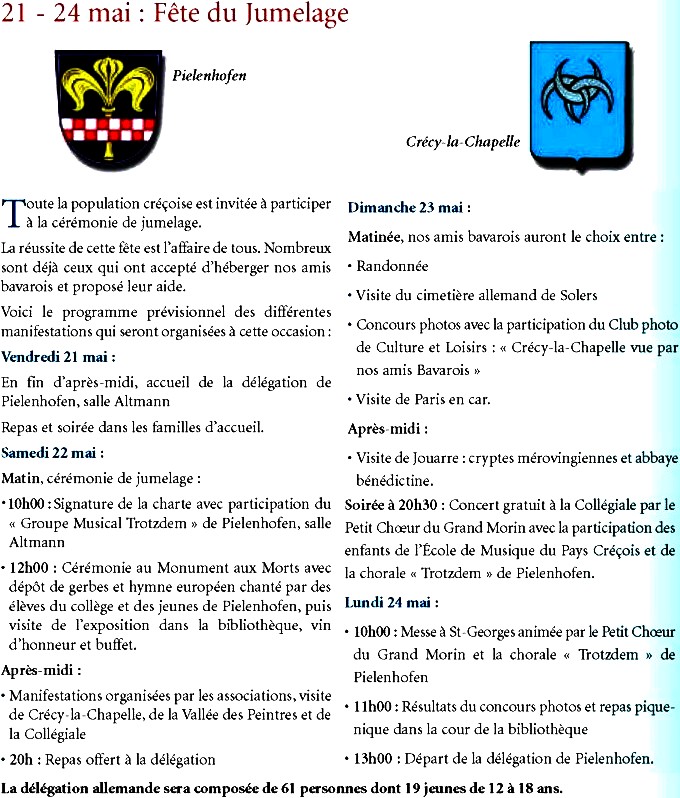 La signature officielle de la charte de jumelage aura lieu le samedi 22 mai à 10h, salle Altmann. A 12h00, cérémonie au Monument aux Morts avec dépôt de gerbe par deux jeunes créçois et deux jeunes bavarois. Dans le cadre des festivités qui seront organisées pendant le week-end de la Pentecôte, la bibliothèque présente la littérature allemande (voir l’affiche). Un concert gratuit se déroulera à la Collégiale le dimanche 23 mai à 20h30 avec la participation de la chorale Trotzdem de Pielenhofen, du Petit Choeur du Grand Morin et de Professeurs et Élèves de l’École de Musique du Pays Créçois (voir l’affiche et le programme).