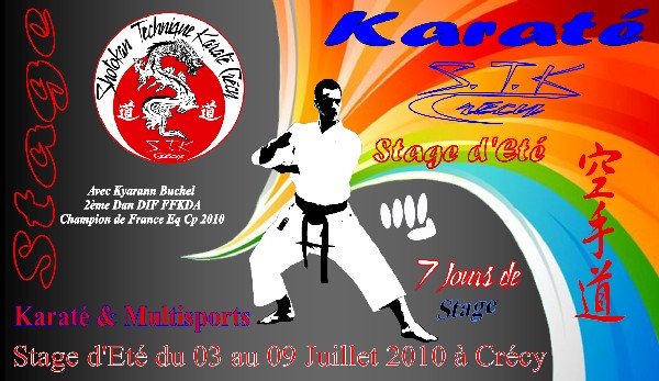 Le STK Crécy organise du 3 au 9 juillet un stage Karaté et multi-activités. A ce stage et comme pour tous nos stages, 10 places sont offertes à la Mairie de Crécy pour des enfants ne pouvant partir en vacances et souhaitant s’initier à notre sport.