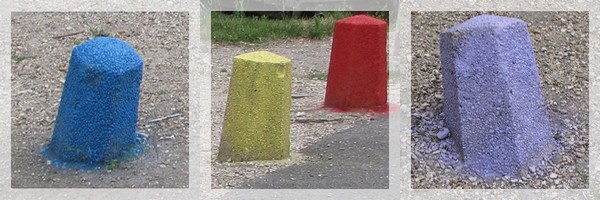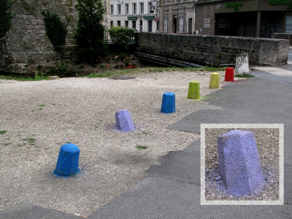 | Sauriez-vous dire où se trouvent ces plots multicolores. Eh oui, une nouvelle espèce de taggeurs semble avoir sévi dans les  rues de Crécy ces dernières heures.  Ce seraient plutôt des amis de la couleur qui ont tenté d’égayer ces mornes plots de béton tout dégingandés. Il ont aussi coloré un banc du côte du tennis.  C’est affaire de goût, mais au final pas forcément plus laid que le gris-olive sui recouvre le mobilier urbain et les ponts. La réponse à la question est dans la suite. |