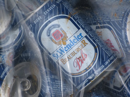 TROIS grands sacs pleins de canettes de bière, toutes de la même marque. St Wendeler Brauburger Pils, brasseur dans le Saar depuis 1836.