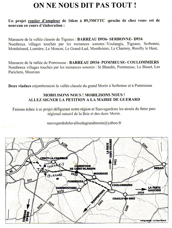 La résistance au projet, très forte dans la région, s’organise, se structure. Mais la démarche consiste aussi à proposer une alternative pour le désenclavement de Coulommiers. Une critique constructive et intelligente donc, afin de ne pas laisser faire ce n’importe quoi dont on nous a tant parlé ces dernières semaines. Le tract diffusé dans les boites aux lettres en juillet : ![]() Le document d’étude publié dans le numéro de juin du bulletin de la Brie des Moulins présente les différentes variantes à l’étude : jms |