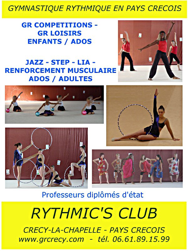 Elle s’appuie sur des accessoires appelés engins, au nombre de 5 : cerceau, corde, ballon, ruban et massues. En pays créçois, le seul club qui pratique ce sport est Rythmics’ club (anciennement La Bande Joyeuse, créée à l’origine en 1952 à Crécy). A Rythmic’s Club on peut aussi pratiquer le Modern Jazz, le LIA ou encore le STEP. Rythmic’s Club sera présent au Forum des Associations à Crécy-la-Chapelle le 12 septembre où vous pourrez assister à des démonstrations. site : http://www.grcrecy.com/ |