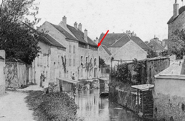 ![]() Sur la carte postale du début du XXème siècle, on aperçoit au dernier étage d’un bâtiment, les clins des séchoirs, caractéristiques d’anciennes tanneries. Le bâtiment marqué par la flèche a disparu, remplacé par un immeuble sans charme, dans les années 70-80. |