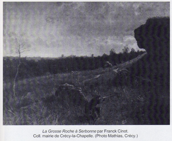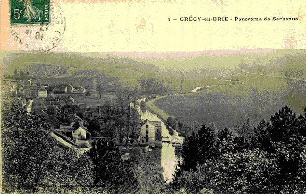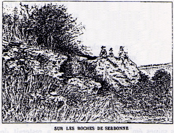 Extrait de : Crécy, Esbly et leurs environspar Georges Husson "… un chemin de terre dans lequelnous allons nous engager. Il a un nom : « Le chanvier » (ou lechemin des Morts). A son extrémité, nous nous trouvons arrêtés par une collineà pic, plantée de sapins, tapissée de fougères, et toute hérissée d’énormesroches. C’est la colline de Serbonne, une des merveilles de la vallée.