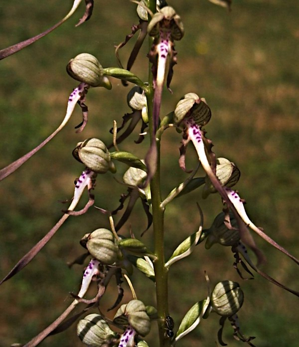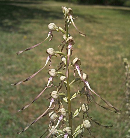 Appelée aussi "orchis à odeur de bouc" pour son fumet peu agréable, cette plante robuste, aux feuilles ayant l’aspect d’une plante grasse, arrive à floraison vers mai – juin. Formée de deux tubercules et de racines cylindriques, sa tige peut atteindre 90 cm de hauteur. Elle possède de nombreuses feuilles d’un vert grisâtre qui apparaissent en automne, persistent l’hiver puis se flétrissent à la floraison. L’inflorescence est cylindrique et assez dense, fleur verdâtre bordée de pourpre, sépales et pétales rassemblés en casque, labelle très allongé, de plus de 5 cm, enroulé et plus ou moins déployé à l’horizontal à floraison.