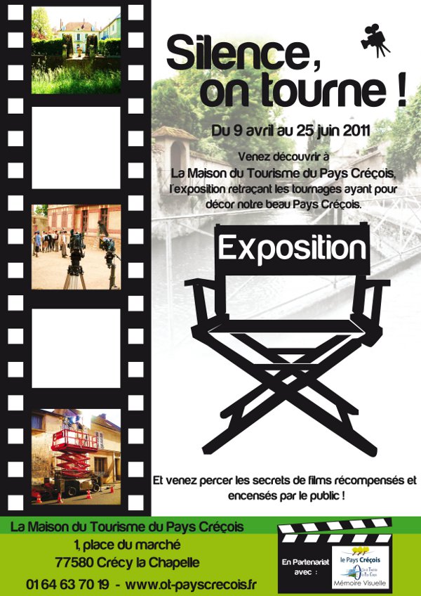 « L’exposition «Silence, on tourne ! Les films tournés en Pays Créçois », se tiendra à la Maison du Tourisme du Pays Créçois à Crécy-la-Chapelle du 9 avril au 26 juin 2011. Née du partenariat entre la Maison du Tourisme du Pays Créçois et une étudiante en BTS Tourisme Animation et Gestion Touristiques Locales de l’Ecole Nationale de Commerce. L’exposition présente les sites du Pays Créçois qui ont servi de lieux de tournage. Des affiches, photos, objets ou encore articles de journaux vous feront découvrir des endroits cachés de vos villages qui ont inspiré les professionnels du cinéma pour leurs fictions. De nombreux habitants du Pays Créçois ont répondu à l’appel de Cécile Le Sache, et lui ont ouvert les portes de leurs domiciles, immortalisés à l’écran. Vous retrouverez à la Maison du Tourisme leurs témoignages. Venez découvrir les dessous des films et téléfilms tels que Marie Besnard, Landru, le Silence de la Mer, …