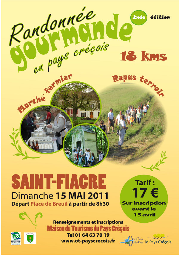 Une balade originale et gourmande autour de Saint-Fiacre qui vous fera découvrir le patrimoine rural de notre territoire, et les spécialités de producteurs locaux. Cette manifestation consiste en une boucle de 18 km environ autour du village de Saint Fiacre, en passant par ses lieux historiques, comme la fontaine du Saint jardinier. Les spécialités dégustées lors des haltes programmées constitueront votre repas, et vous pourrez retrouver ces produits au marché du terroir qui se tiendra à Saint Fiacre de 16h à 19h, sur la place de Breuil. Venez découvrir, ou redécouvrir, des produits locaux tels que le cidre, le jus de pommes, le miel, ou encore des farines, des volailles, des produits dérivés du chanvre… Tous exclusivement seine-et-marnais ! La randonnée est ouverte aux clubs de marcheurs (dans la limite de 200 places), et aux individuels (dans la limite de 50 places). Le tarif est de 17€ par personne. Les inscriptions se font auprès de la Maison du Tourisme du Pays Créçois, et sont ouvertes jusqu’au 15 avril. Le marché du terroir est bien sûr ouvert à tous, de 16h à 19h, sur la place de Breuil. Cette manifestation est organisée par l’Association de l’Office de Tourisme du Pays Créçois, en partenariat avec la municipalité de Saint Fiacre et la Chambre d’Agriculture de Seine-et-Marne.
