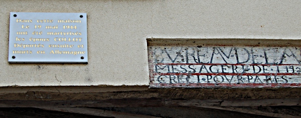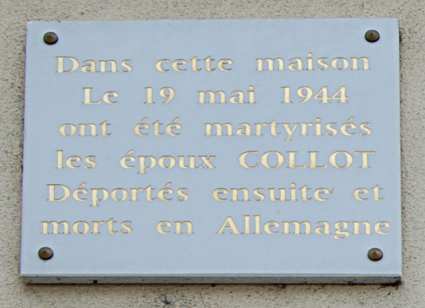 « Dans cette maison, le 19 mai 1944, ont été martyrisés les époux COLLOT. Déportés ensuite et morts en Allemagne. »
