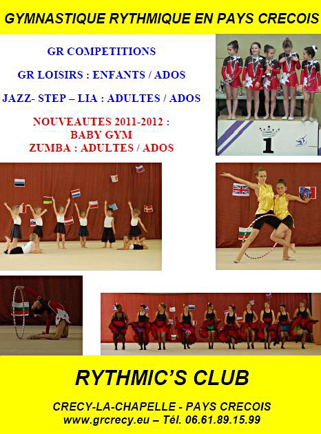 Elle s’appuie sur des accessoires appelés engins, au nombre de 5 : cerceau, corde, ballon, ruban et massues. A Rythmic’s Club on peut aussi pratiquer le Modern Jazz, le LIA ou encore le STEP. Cette année 2 nouvelles activités sont proposées : La baby Gym et la Zumba. Rythmic’s Club sera présent au Forum des Associations à Saint-Germain-sur-Morin le 11 septembre où vous pourrez assister à des démonstrations. La saison de Rythmic’s Club se termine toujours pas un spectacle où chaque activité participe. Cette année le thème en était l’Europe. Cet article est illustré des photos de cet événement. site : http://www.grcrecy.eu/ |