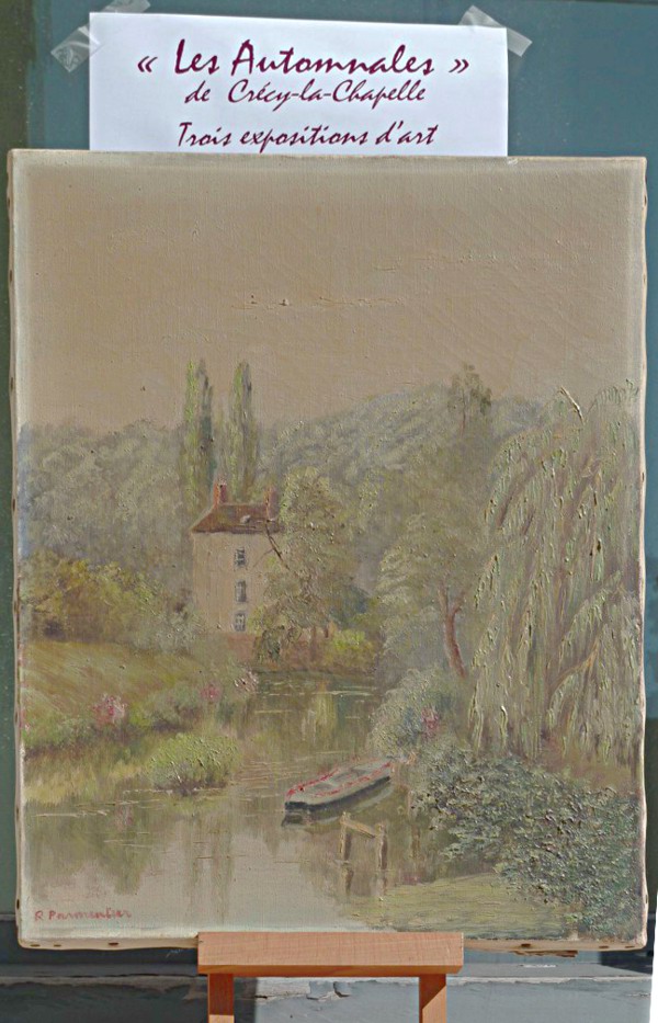 Cette huile sur toile, signée R. Parmentier, a été peinte en 1957, et acquise par une famille parisienne, dont les promenades dominicales avaient l’habitude de les mener à Crécy. |