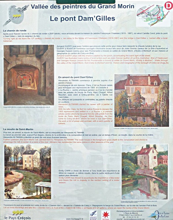 ![]() Il s’agit d’une peinture sur le motif (ou peinture en plein air, à l’extérieur, dans la nature) que cette famille a acquise au cours de l’année 1957. A la faveur d’une enchère heureuse, elle a maintenant rejoint sa vallée natale. On peut dire qu’elle a beaucoup voyagé puisque sa précédente propriétaire vit dans l’Hérault, et se réjouit d’ailleurs que des Créçois aient eu envie de rapatrier cette vue du Grand Morin près de son lit.