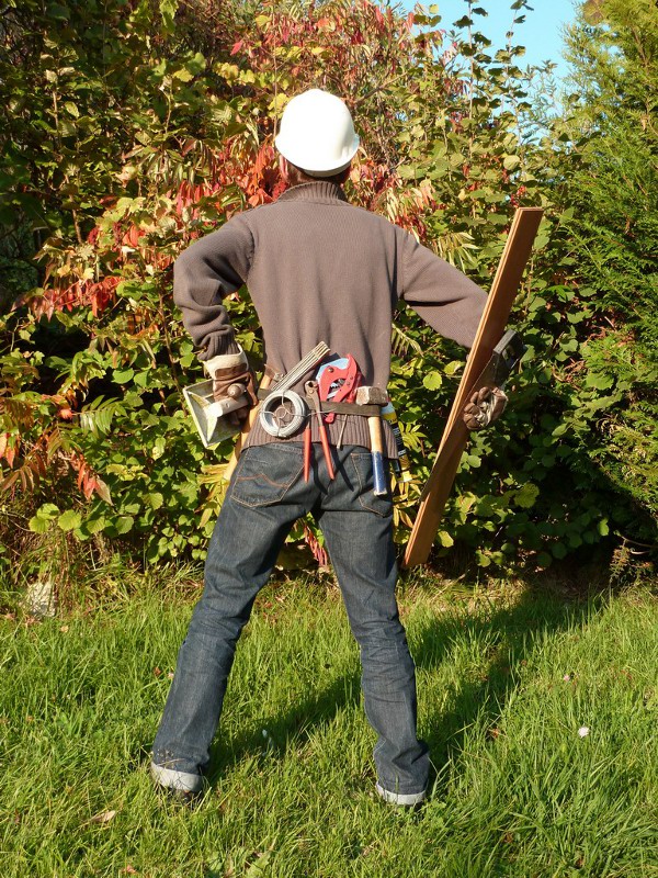 Plus précisément et directement, ce personnage ne semble être, tout entier, qu’un costume, qu’une tenue de travail, -coiffé d’un casque de chantier, paré de gants de protection, porteur d’une planche et surtout d’une ceinture d’outils (motif central de l’image).