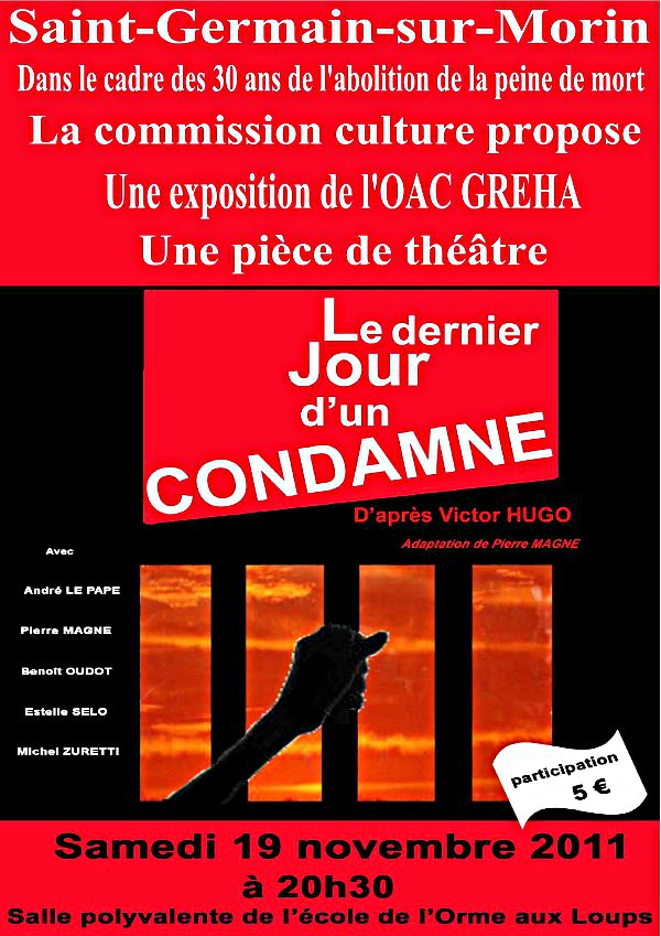 Il y a trente ans, M. Badinter prononçait un discours devant les députés de l’Assemblée Nationale afin d’abolir la peine de mort dans notre pays. L’article premier du projet de loi « la peine de mort est abolie » fut adopté par 368 voix contre 113 le 17 septembre 1981, la loi fut promulguée le 9 octobre 1981. L’abolition n’était pas seulement un article de foi pour la gauche, elle ralliait aussi nombre de partisans de droite. Le 3 janvier 2006, Jacques Chirac, président de la république, annonçait la révision de la Constitution française avec un nouvel article qui disposait que « nul ne peut être condamné à mort, exauçant le vœu de Victor Hugo « l’abolition pure, simple et définitive de la peine de mort » prononcé lors du débat sur l’abolition en 1848. La commission culture souhaite commémorer cet évènement qui a fait entrer la France dans le groupe des pays abolitionnistes et qui a renforcé les principes humanistes de notre pays. Le 19 novembre 2011, dans la salle polyvalente de l’école de l’Orme aux Loups, la commission culture vous propose, sur une idée de Pierre Magne, un spectacle de théâtre tiré du livre de Victor Hugo, « le journal d’un condamné », une manifestation qui débutera par la lecture d’extraits du discours de M. Badinter et la visite de l’exposition préparée par l’Office d’Action Culturelle de Saint Germain sur Morin. Nous vous attendons nombreux pour fêter ensemble cet évènement important de notre histoire commune. Martine Robert – Conseillère municipale et membre de la commission culture – Saint-Germain-sur-Morin |