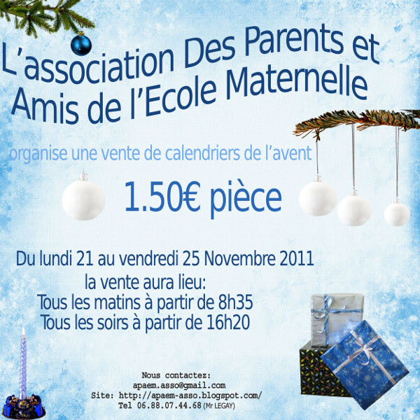 L’Association des Parents et Amis de l »Ecole Maternelle (APAEM) "Les Promenades" à Crécy-la-Chapelle organise une vente de calendriers de l’avent tous les matins et soirs du 21 au 25 Novembre 2011.