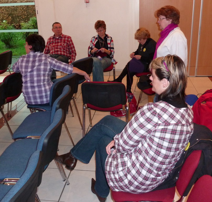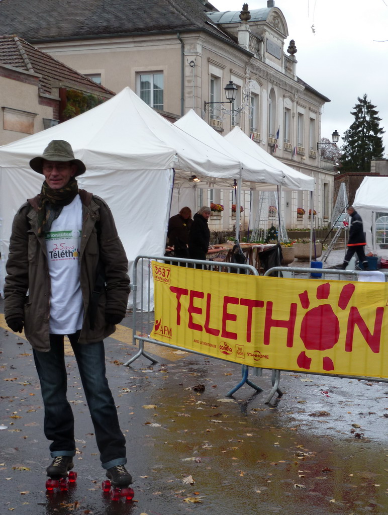 "Compte-tenu des conditions météo, le fil rouge "Roller-patins à roulettes-patinette" ne pouvait pas être sécurisé, il a donc été annulé. Sous la pluie pas d’adhérence, c’est la chute assurée. Même si les JSP étaient présents, les organisateurs n’ont pas tenté le diable. J’ai quand même fait quelques tours à mes risques et périls, mais j’avoue que ça glissait bien ! Le fil rouge "tricot" était bien parti, avec un appel aux aiguilles N°5 qui manquaient pour tricoter plus vite le point mousse. Même si le soleil n’est pas au rendez-vous, il brille dans le cœur des bénévoles, qui assurent contre vents et pluies. Le fil rouge "écharpe autour du beffroi" a été un succès, l’écharpe assemblée a été mesurée vers 19h, pari gagné avec 21,15 mètres. La circonférence du beffroi est de 10 mètres (selon les organisateurs), soit de quoi faire 2 fois le tour." Du côté des organisateurs, Michelle Beurrier témoigne : En images voici un souvenir de ce téléthon : |