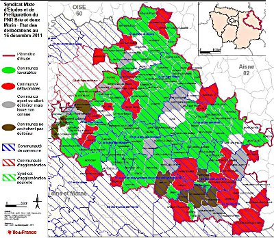 Les communes en rouge ont refusé d’adhérer au syndicat qui va construire la charte. Elles pourront le rejoindre par la suite avant le démarrage du PNR. On espère bien que certaines changeront d’avis. Mais cela ne pourra pas être contre leur gré évidemment.