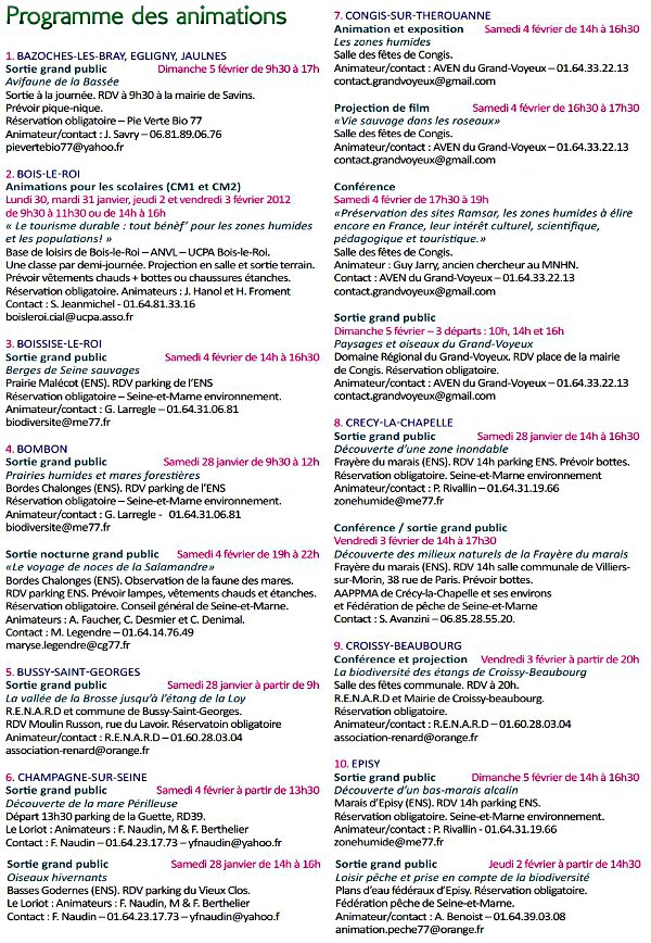 pour avoir accompagné plusieurs fois, ces dernières années, des sorties animées par le passionnant et passionné Jacques DUMAND, (cité sur le calendrier d’animations de cet article) : je vous les recommande! Découvrir aux alentours des étangs de Torcy, Croissy-Beaubourg, etc, autant de refuges tranquilles, si proches mais si protégés de la ville, est une expérience inoubliable! Surtout si vous avez la chance d’apercevoir, ou même de photographier (de loin) le rare, le timide, le fugace petit héron Blongios… Et connaissez-vous la petite réserve du Bois de Vaires-sur-Marne, classée site Natura 2000? A visiter, toujours avec Jacques DUMAND. Il vous y révèle, entre autres merveilles, l’existence d’une petite mare abritant des spécimens de batraciens et surtout de tritons justement protégés! Et, selon les saisons, on peut faire des rencontres inattendues : une renarde arrêtée dans sa traversée du sentier; une prairie d’orchidées intouchée; une course de marcassins pressés… et bien d’autres surprises!
