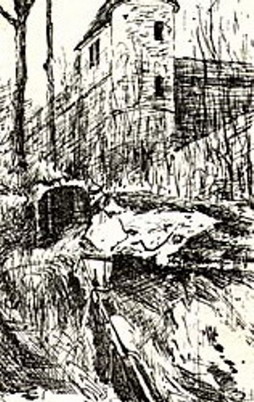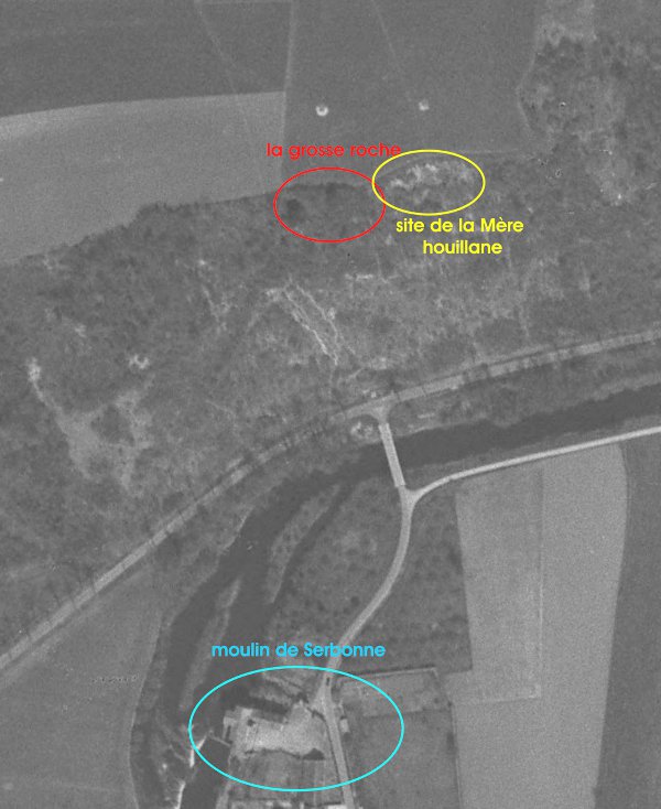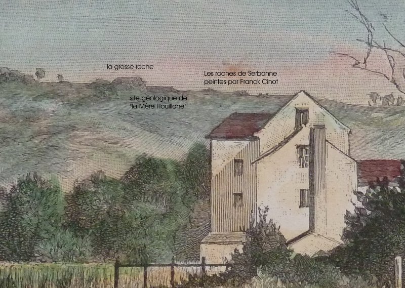 Aux extrémités de la muraille, on trouve deux tours encore debout et un chemin qui donne accès à une esplanade panoramique, d’où la vue sur Meaux est magnifique. Démantelé puis vendu comme bien national en 1791, le couvent est aujourd’hui une propriété privée. Voilà donc le mystère de la roche de Crégy élucidé. Lavoisier nous décrivait les roches ainsi : ![]() ![]() La roche de Serbonne fût aussi peinte par des artistes de la région, comme Franck Cinot, né à Saint-Martin les Voulangis en 1851, et décédé à Crécy-en-Brie en 1890. Enfant du pays et élève d’Amédée Servin, son grand-père fût maire de Crécy de 1840 à 1844, puis adjoint au maire les 4 années suivantes. Il était membre, comme Théophile Lhuillier et le docteur Théodore Robillard, de la Société d’archéologie de Seine-et-Marne. On peut également apercevoir la roche de Serbonne sur ce dessin de François Richard de Montholon (1856-1940), qui fût un contemporain de Cinot. ![]() Et voici un détail de cette gravure montrant les roches, à la fin du XIXème siècle. ![]() En prenant de la hauteur, on aperçoit sur cette prise de vue aérienne de la région, photographiée en 1951, le site de la mère Houillane, qui nous indique l’emplacement de la roche.