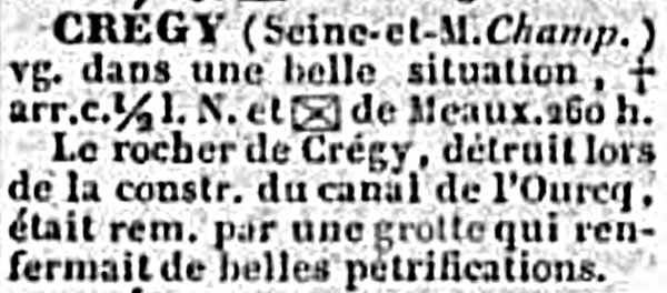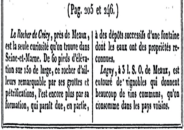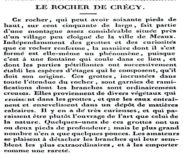 Je cherchais donc dans les vieux ouvrages un témoignage ou une trace de son existence, avec comme mots-clés "rocher de Crécy". Voici tout d’abord ce que ce j’ai trouvé : ![]() Curieuses mentions qui accompagnent ce descriptif. Crécy situé près de Meaux, et ces dépôts de matière calcaire, alors que le rocher de Serbonne est certes composé de calcaire, mais aussi de silex… Autre extrait étrange issu de l’Itinéraire complet du royaume de France: divisé en cinq régions : Je poussais plus loin les recherches, pour tomber cette fois sur le texte suivant, issu de "L’anarchasis Français, ou description historique et géographique de toute la France", paru en 1822 : "Laissant à gauche l’avenue du château de Martray, je descends vers la plaine au milieu de laquelle Meaux se trouve situé; j’arrive au faubourg de Saint-Remy; j’entre dans la ville, gagne la place Saint-Etienne, descends à l’Hôtel de la Syrène. Il n’est pas quatre heures encore : j’ai bien envie d’aller à pied voir le rocher de Crécy dont on m’a parlé. On ne compte que trois petites lieues (lieue métrique = 4 km*). Je serai de retour d’assez bonne heure. Comment ce jeune voyageur peut-il situer le rocher de Crécy à trois lieues (12 kilomètres) tout en partant de la place Saint-Etienne à Meaux, alors que ma boussole de voiture, mon fidèle DomDom, annonce 26 kilomètres ? Autre détail troublant : les dimensions du rocher."Ce rocher, situé sur une montagne, a par lui-même soixante pieds *(un pied = environ 30 centimètres) de haut sur cent soixante de large", soit de nos jours 18 mètres de haut par 48 mètres de large. * notes ajoutées pour la compréhension du texte. Je trouvais enfin ce qui devait me mettre sur la voie, dans le "Dictionnaire géographique de la France" :