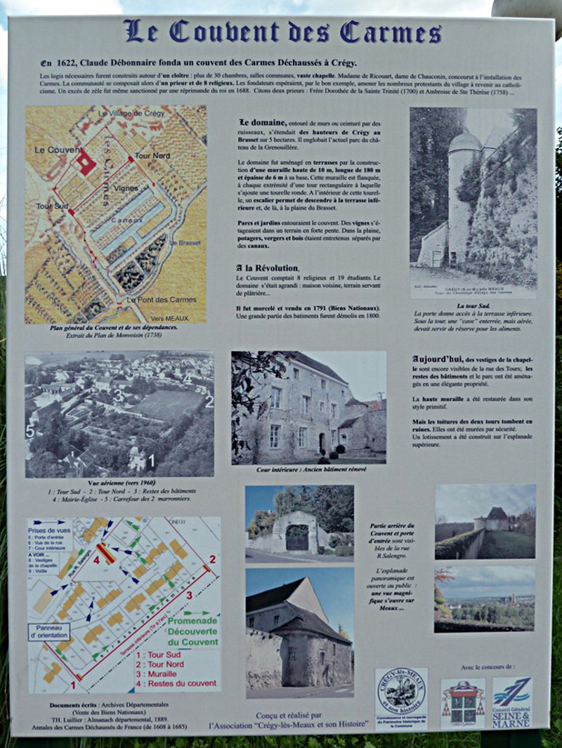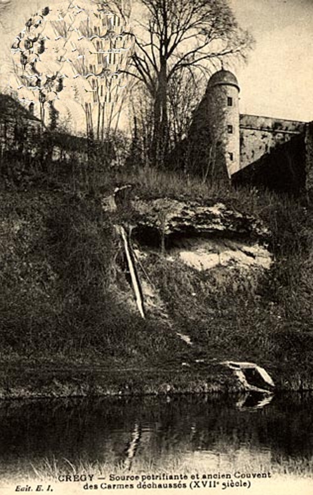 On peut lire sur le site officiel de Crégy-les-Meaux :"Dans le flanc du coteau sur lequel s’élève Crégy, existait autrefois un rocher remarquable par ses grottes et ses pétrifications; il a été en grande partie détruit pour faciliter le passage du canal de l’Ourcq. Guettard cite comme une curiosité naturelle très intéressante cette roche de 60 pieds d’élévation, sur 150 pieds d’étendue, curieuse non seulement par ses grottes, mais aussi par sa formation même, due à une source dont l’eau, chargée de matière calcaire en dissolution, jouissait des même propriétés pétrifiantes que la fameuse fontaine de Sainte-Allyre à Chermont".On retrouve ici les dimensions citées dans l’extrait ci-dessus attribué par erreur à Crécy. Levant les yeux au dessus de la roche de Crégy, je découvrais comme promis le Couvent des Carmes. ![]() Le Couvent fût fondé en 1622 par Claude Débonnaire, de la chambre du roi Louis XIII, qui avait en tête de ramener les nombreux protestants du village au catholicisme. ![]() Tour Sud vue de l’esplanade