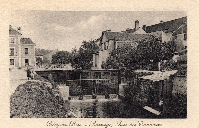 Celui-ci part du petit bras de la rivière pour passer sous le pont court, longer la rue de la halle, arroser le quai des tanneurs avant de rejoindre le Morin. Le vannage est situé au niveau du quai des tanneurs. L’observation attentive des deux cartes postales anciennes présentées ci-dessous est intéressante. Sur la carte la plus ancienne, du tout début du XXème siècle, la vanne n’existe pas/ L’image révèle l’existence des restes d’un ouvrage comme une mini chute, matérialisée par un petit remous d’eau. Sur une carte datée de 1912, une vanne toute neuve est en place. C’est probablement celle que nous connaissons encore aujourd’hui.