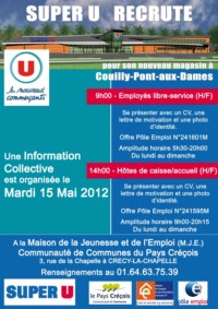 http://www.cc-payscrecois.fr/Super-U-recrute-pour-son-ouverture.html Cependant, la date de l’ouverture n’est pas indiquée. Les réunions d’information pour les 2 types de postes proposés sont prévues le 15 mai : A noter que les mêmes réunions sont programmées en préalable le jeudi 10 mai 2012 à la mairie de Couilly Pont-aux-Dames, la priorité à l’embauche étant donnée aux habitants de cette commune. (voir site de Couilly : http://couilly.free.fr/spip.php?article352.htm) |