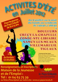 Pour les jeunes du pays créçois, la Communauté de Communes organise des activités sportives et de loisirs, du 9 juillet au 3 août 2012, du lundi au vendredi de 13h30 à 18h30.