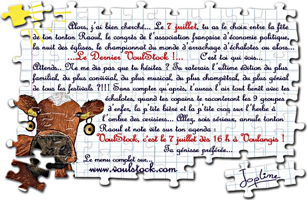 Un texte signé Jopline, la vache mascotte de Voulstock. Pour ceux qui l’ont oublié, le nom de la mascotte « Génisse Jopline » fit l’objet d’un concours de proposition de noms sur notre site.