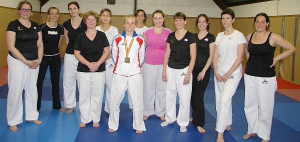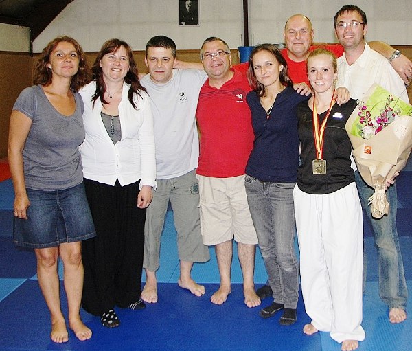 Toute l’équipebody karaté du club Karaté Do Saint Germain sur Morin attendait avec impatiencele retour de son professeur, Clotilde Boulanger, pour fêter et célébrer sonformidable titre de Championne d’Europeen Equipe Kata.