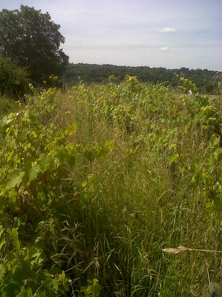 Celui-ci se situe sur le coteau nord de la vallée, en ligne de crête, quelque part entre le quartier des "Rougets" (connu pour son impasse des vignes) et le hameau de Ferolles. Jusqu’à l’an dernier ces pieds de vignes étaient parfaitement bien entretenus, pourtant je n’avais jamais vu personne s’y affairer. Le week-end dernier, voila dans quel état j’ai trouvé la parcelle; toute envahie par des herbes folles. Combien de temps faut-il à la nature pour reprendre ses droits naturels et réduire à néant des années de travail assidu ? |