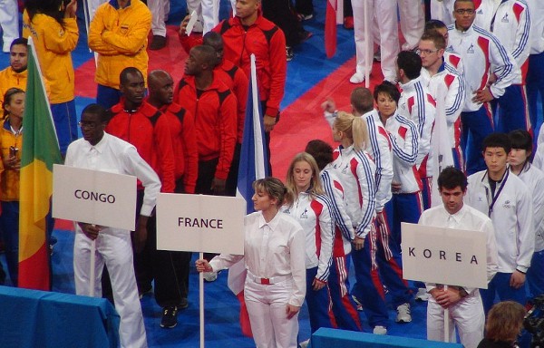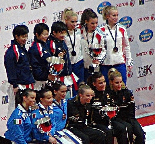 Du Bronze pour Clotilde Boulanger et ses coéquipières, voici l’excellent résultat de l’équipe de France en équipe kata qui gagne sonpari et monte sur le podium de ces 21èmechampionnats du monde dekaraté qui se déroulait à Paris du 21 au 25 novembre 2012. Après untrès beau parcours qui les a opposés à l’équipe de Croatie, à l’équipe duVietnam et à l’équipe d’Italie, les Françaises terminent en demi-finale face àl’équipe du Vénézuéla. C’est dansune salle de Bercy survolté par plusieurs milliers de spectateurs venus les encourager,que Clotilde Boulanger, Sonia Fiuza et Jessica Hugues ont imposé leurs supérioritéslors de la présentation du kata UNSU suivi de son Bunkaï (application en combat du kata présenté). Les 5 jugesinternationaux lèveront sans hésitation leurs drapeaux (5/0) en faveur de l’équipede France sous l’acclamation de près de 15 000 personnes. |