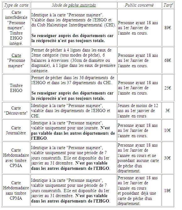 * TABAC LE VILLIERS * Café Restaurant LA TABLE DU CURE Les différentes cartes de pêcheSon paiement est concrétisé par le timbre correspondant,collé sur la carte de pêche et obligatoirement oblitéré. On distingue : ![]() Le contrôle des cartes de pêcheLa carte de pêche est personnelle et incessible et doitobligatoirement comporter une photographie de son titulaire. Le pêcheur doitpouvoir justifier de son identité. La carte de pêche doit être présentée sur lechamp à tous les agents de l’administration chargés de la police de la pêche(gardes-pêche commissionnés de l’ONEMA, gendarmes…) ainsi qu’à tous les gardes-pêchefédéraux ou des AAPPMA munis de leur carte d’agrément. La Loi n’autorise pas leremplacement gratuit des CPMA, en cas de perte de la carte, les CPMA doiventêtre à nouveau acquises. Pour tous renseignements http://aappma77.free.fr Meilleurs vœux à tous de toute l’Equipe de L’AAPPMA de Crécy-la-Chapelle et ses environs Le Président Serge AVANZINI |