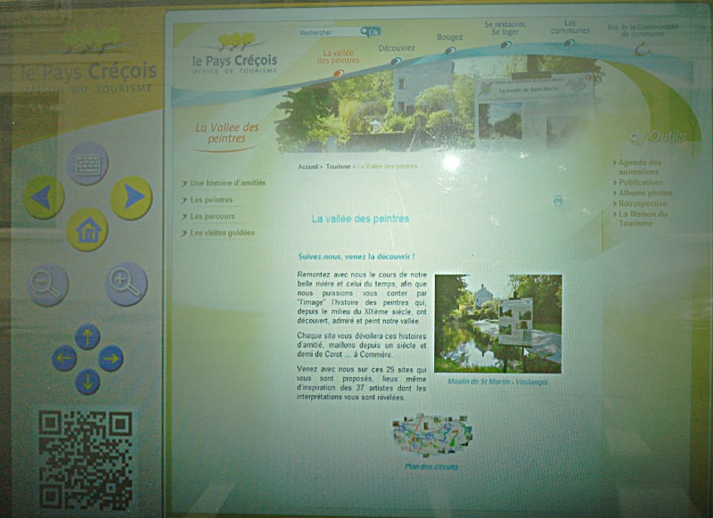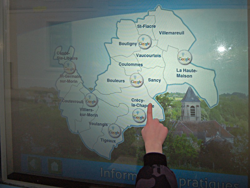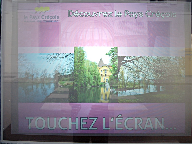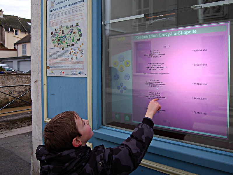 A la base c’est un ordinateur dont les informations sont projetées sur la vitrine depuis un vidéo-projecteur situé au plafond du local. Par contre, il n’est pas possible d’aller naviguer librement sur internet, ce n’est pas le but recherché. Des QR codes permettent d’accéder aux informations depuis son smartphone. L’objectif est de pouvoir télécharger les plans des circuits sur son téléphone avant de partir en randonnée. Les quelques passants qui se promenaient dans Crécy s’arrêtaient devant la vitrine et s’amusaient à la toucher. Un bon début et un bon réflexe. Alors n’hésitez pas à venir faire un tour à la maison du tourisme et à attiser votre curiosité en touchant la vitrine. ![]() La vitrine tactile est implantée sur la partie gauche de la devanture de la maison du tourisme.