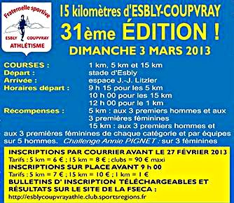 De 15 communes, nous sommes passés à 19 avec Esbly, Couilly, Montry et Quincy. Un mariage de raison, les 2 dernières communes citées étant un peu "forcées" par les décisions préfectorales. J’ai voulu illustrer cet événement par l’annonce (la première concernant les communes entrantes sur la site de la CCPC) des 15km d’Esbly-Coupvray. Un événement sportif désormais d’importance communautaire et non plus simplement communal. Plus politique et solennel, toujours sur le site de la CCPC, vous pourrez lire le CR du premier conseil intégrant une nouvelle commune, en l’occurrence Esbly :http://www.cc-payscrecois.fr/IMG/pdf/PV_24_janvier_2013.pdf Pourquoi seulement Esbly ? Avant le diktat préfectoral, seulement Esbly devait rejoindre la CCPC au 1er janvier, Couilly ne devait arriver qu’en 2014, et les autres ne voulaient pas venir. On peut donc comprendre qu’elles ne soient pas prêtes, même si du côté de Couilly on est très enthousiasmé par ce rapprochement :http://couilly.free.fr/IMG/pdf/payscrecois.pdf Pour revenir aux 15km d’Esbly-Coupvray, voici le bulletin d’inscription à télécharger : Bulletin d’inscription 2013 |
