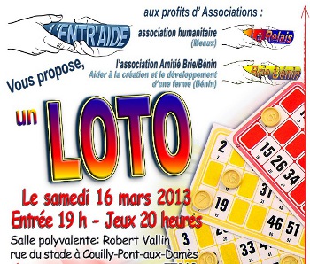 Samedi 16 mars 2013, l’Association l’Entr’Aide organise un loto dans la salle Polyvalente de Couilly Pont aux Dames.