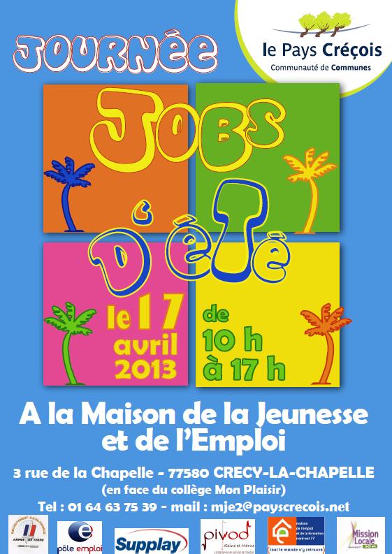 | La Maison de la Jeunesse et de l’Emploidu Pays Créçois organise sa journée JOBS D’ÉTÉ  le mercredi 17 avril 2013 de 10h à17h, dans ses locaux, 3 rue de la Chapelle àCrécy-la-Chapelle (au 1er étage de la Communauté de Communes,devant le collège Mon Plaisir) Lorsde cette journée, les jeunes âgés de 18 ans et plus pourront : – consultertoutes les offres collectées -avoir un(des) entretien(s) d’embauche avec les employeurs présents -obtenir une aide au CV et à la rédaction d’une lettre de motivation L’entréeest libre et gratuite. Renseignementsauprès de la Maisonde la Jeunesseet de l’Emploi au 01 64 63 75 39. |