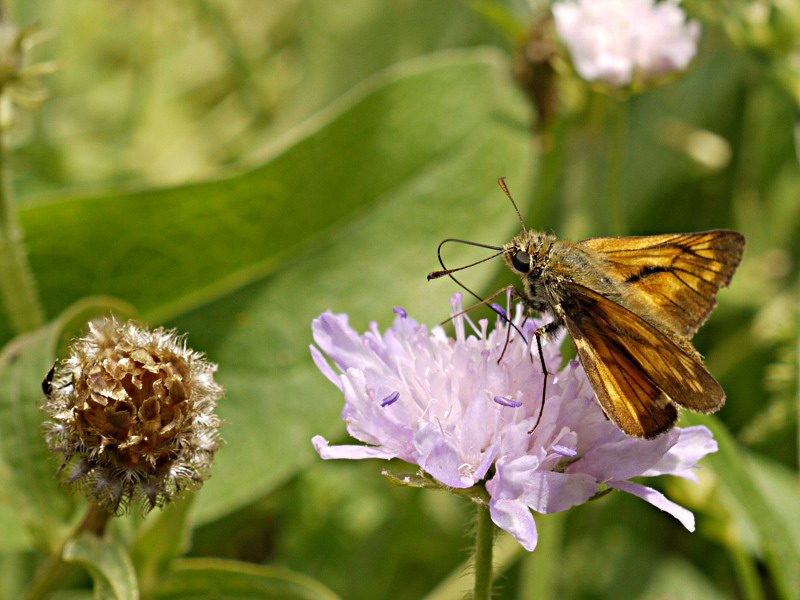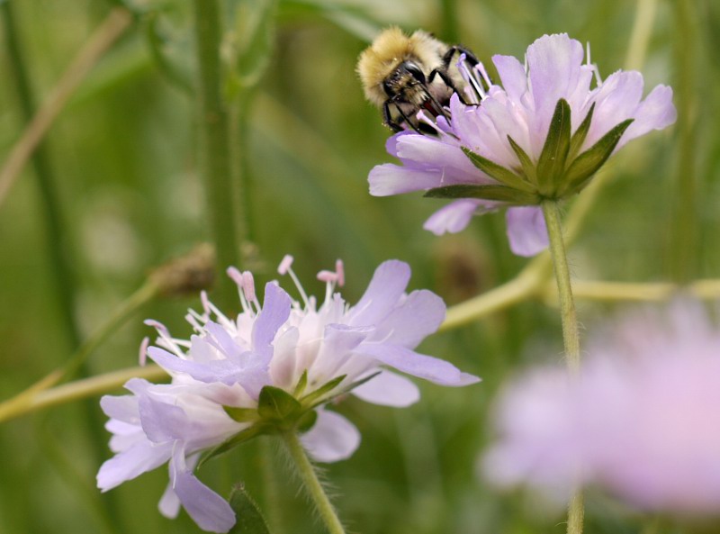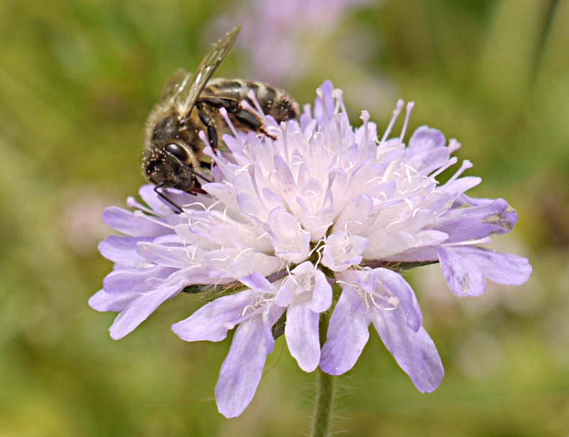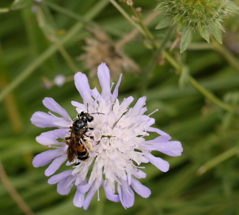 Sur la photo au dessus de celle de l’araignée, vous pouvez apercevoir l’andrène de la scabieuse, une abeille élégante et longiligne, reconnaissable à ses points sur l’abdomen et ses poils orangés. Cette abeille est solitaire, et dite inféodée à cette espèce, car elle ne récolte le pollen nécessaire pour se nourrir que sur cette fleur.