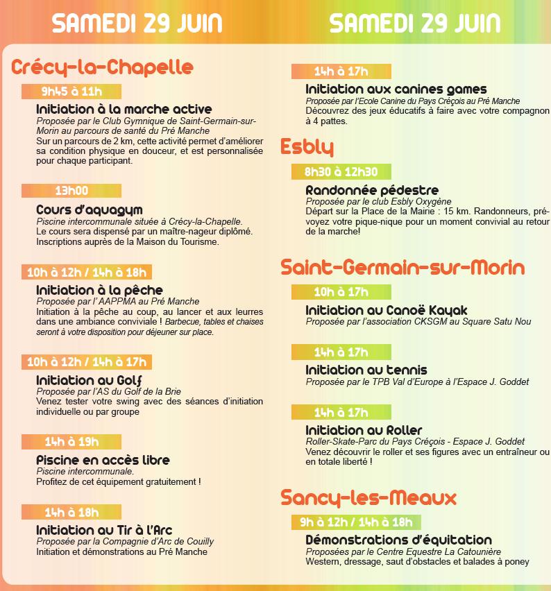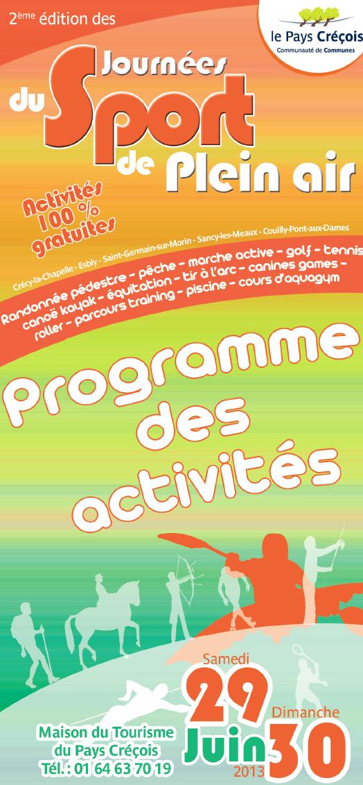 La Communauté de Communes du Pays Créçois organise la 2ème édition des journées du sport de plein air les 29 et 30 juin 2013. Activités 100 % gratuites sur les communes de Crécy-la-Chapelle, Esbly, Couilly-Pont-aux-Dames, Saint-Germain-sur-Morin et Sancy-lès-Meaux.