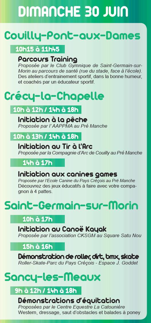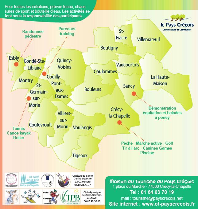 – Crécy-la-Chapelle : Marche active, cours d’aquagym, initiation à la pêche, initiation au golf, piscine en accès libre, initiation au tir à l’arc, initiation aux canines games