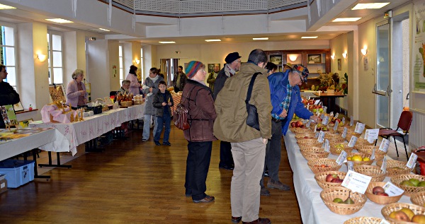 Un événement de saison dans une commune où la pomme est encore à l’honneur au travers de ses nombreux petits vergers si typiques de notre région. Les pommes de la brie étaient présentes : Faro, Belle Joséphine, Marie-madeleine, Vérité, … mais il y avait aussi des pommes de toute la France, et pas que des pommes. En effet, il y a quelques semaines nos croqueurs de pommes locaux participèrent à Limoges aux 35 ans des croqueurs de pomme au niveau national, et c’est de là qu’ils ont ramené toute sortes de pommes mais aussi des fruits italiens bien étranges. Tartes aux pommes, pressage, jus et cidre complétaient l’exposition, sans oublier les produits des abeilles, ces petites bêtes bien utiles à nos arbres fruitiers. Terroir, automne, patrimoine naturel rimèrent avec saveur et bien vivre ce week-end à Voulangis. |