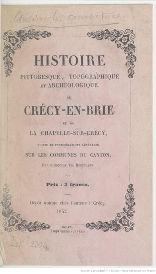 | Enfin  disponible en version intégrale et numériséesur le site gallica de la Bibliothèque Nationale de France, je vous propose dedécouvrir  la toute première monographie deCrécy-en-Brie et de la Chapelle-sur-Crécy, imprimée en 1852, par le Dr ThéodoreRobillard et annotée par le jeune Théophile Lhuillier.