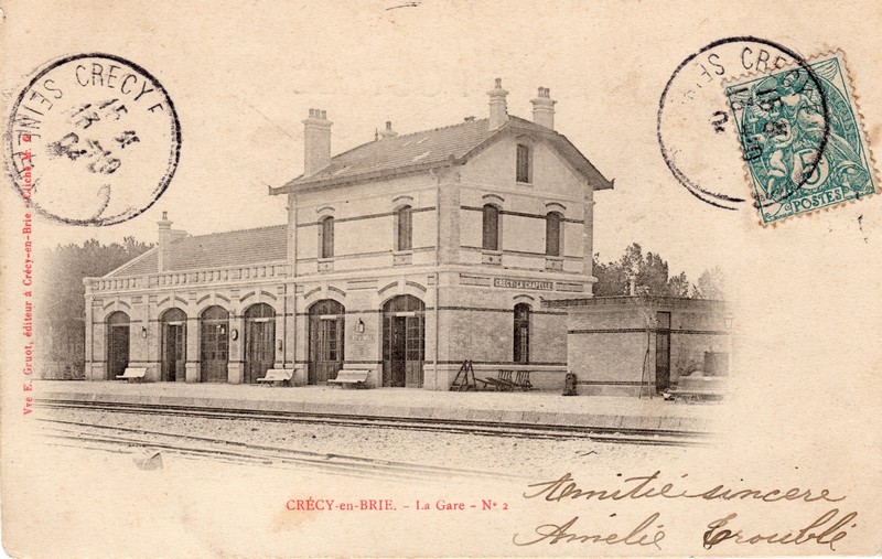 Editeur Chambault. Sur cette carte prise dans le sens Villiers-Crécy la loco est à la manoeuvre. Il y a du monde sur le quai et pas mal de casquettes et de képis. Des cheminots de la compagnie de l’Est ? La photo nous montre également le hall des marchandises avec des wagons à quai. A l’époque, le transport des marchandises à lui seul aurait suffi à justifier la création de la ligne. A travers différentes lectures, il apparait que le trafic annuel de marchandises sur la ligne se chiffrait en milliers de wagons : des produits agricole, maraîchers, du bois, …