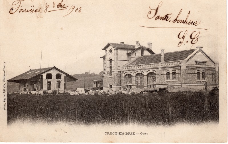 Détail du chantier : Cette carte nous permet de nous arrêter sur l’architecture de la gare. La gare de Crécy a en effet été la première d’un nouveau genre architectural déployé par la Société des Chemins de Fer de l’est. Bâtiment avec plan asymétrique, avec un pavillon à étage en extrêmité et une aile en rez de chaussée facilement extensible. Par un escalier en tourelle, on accède à l’appartement du chef de gare situé au-dessus des salles d’attente, avec un deuxième étage légèrement mansardé. On peut considérer que la gare de Saint Germain fut la seconde à être construite selon le même plan, mais l’aile "à géomètrie variable" est plus courte d’une travée.