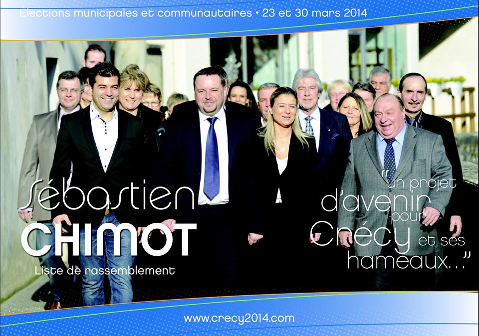 J’y ai relevé deux points importants : – un élu gérant le partenariat avec les associations – faciliter l’accès de tous à une activité Cet article est aussi l’occasion de présenter la photo de l’équipe qui vient d’être publiée sur le compte facebook de campagne : "Sebastien Chimot – Crécy la Chapelle 2014" |