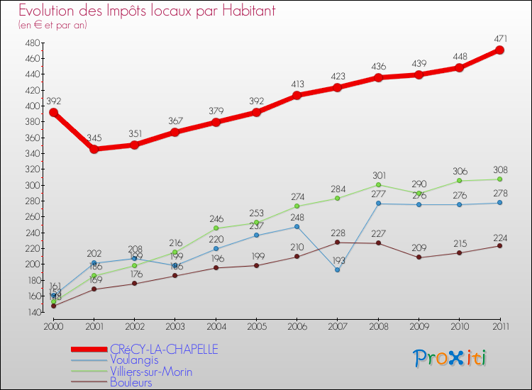Le montant de l’impot total par habitant sur la decennie à Crécy, Villiers, Voulangis et Bouleurs