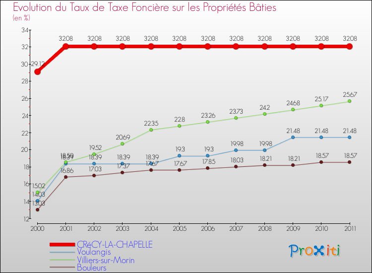 L’évolution du taux de taxe fonciere des propriétés baties sur la decennie à Crécy, Villiers, Voulangis et Bouleurs