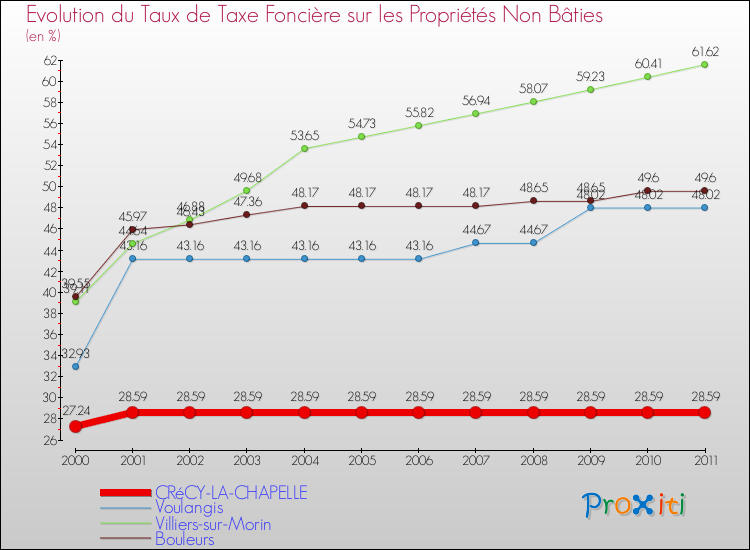 L’évolution du taux de taxe fonciere des non propriétés baties sur la decennie à Crécy, Villiers, Voulangis et Bouleurs