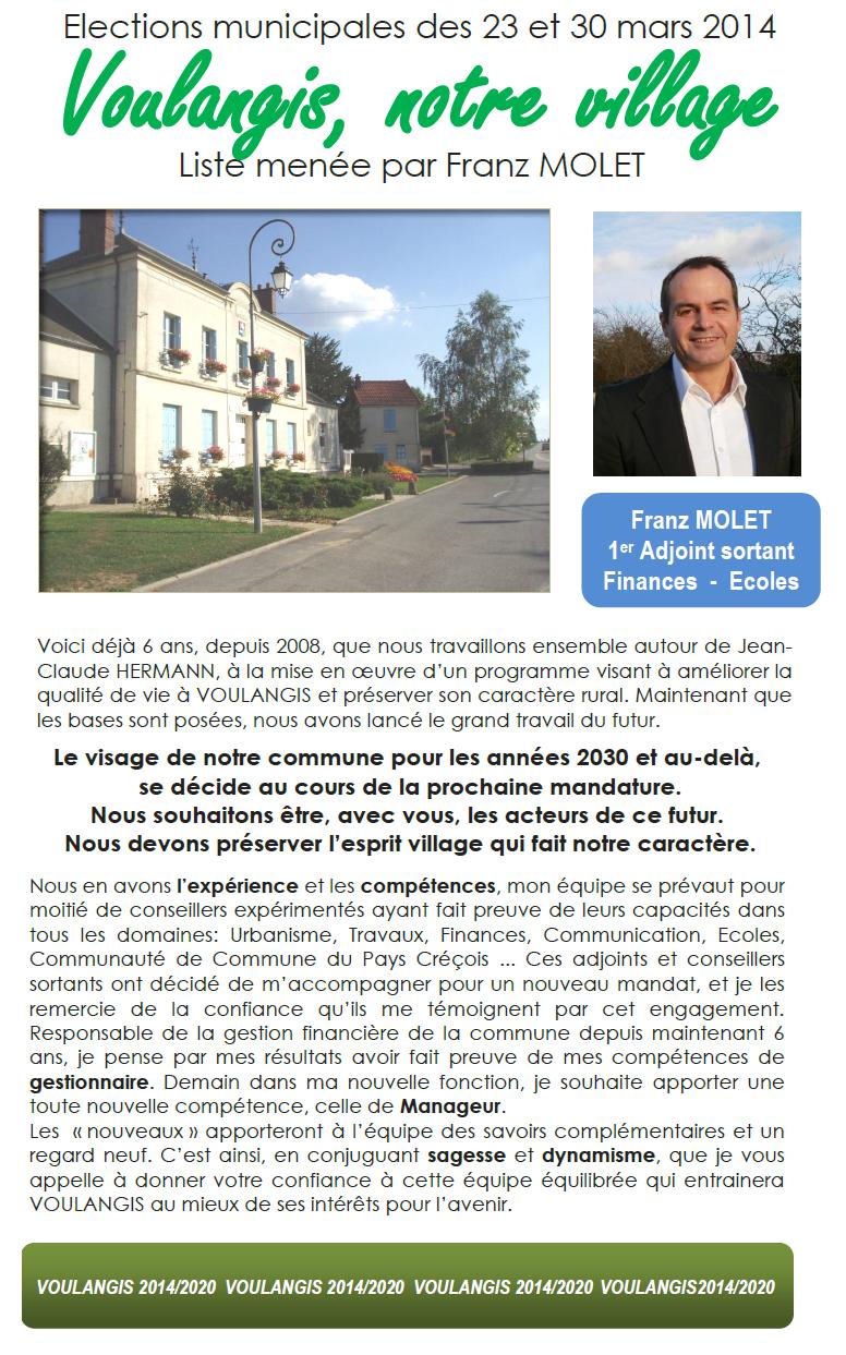 Le premier tract de l’équipe de Franz Molet a été distribué fin de semaine dernière dans tous les foyers de Voulangis.